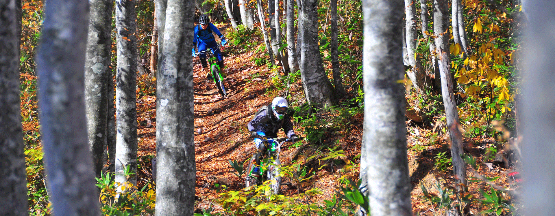 岩岳の森を大冒険する本格クロスカントリーコース。気持ちのいいシングルトラ ックあり、激しいアップダウンありのバリエーション豊かなクロスカントリーを堪能できます。きつく難しい場所は自転車を降りて、ひと休み。のんびり歩けば気持ちいい森林浴が味わえます。